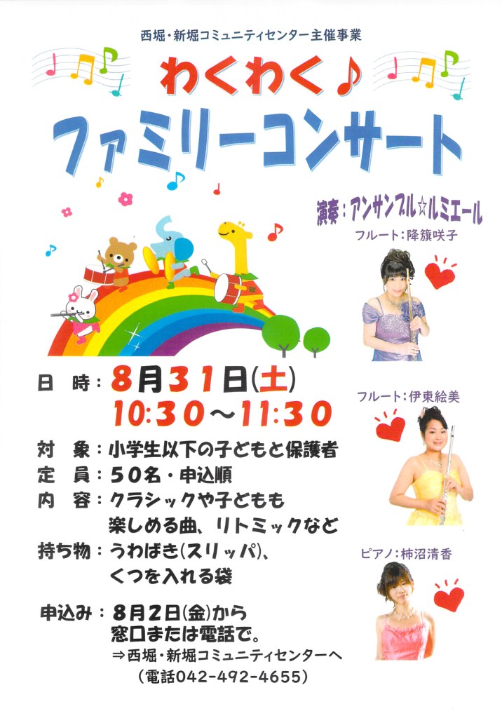 フルート2本+ピアノによるリトミック付きファミリーコンサートが行われます。